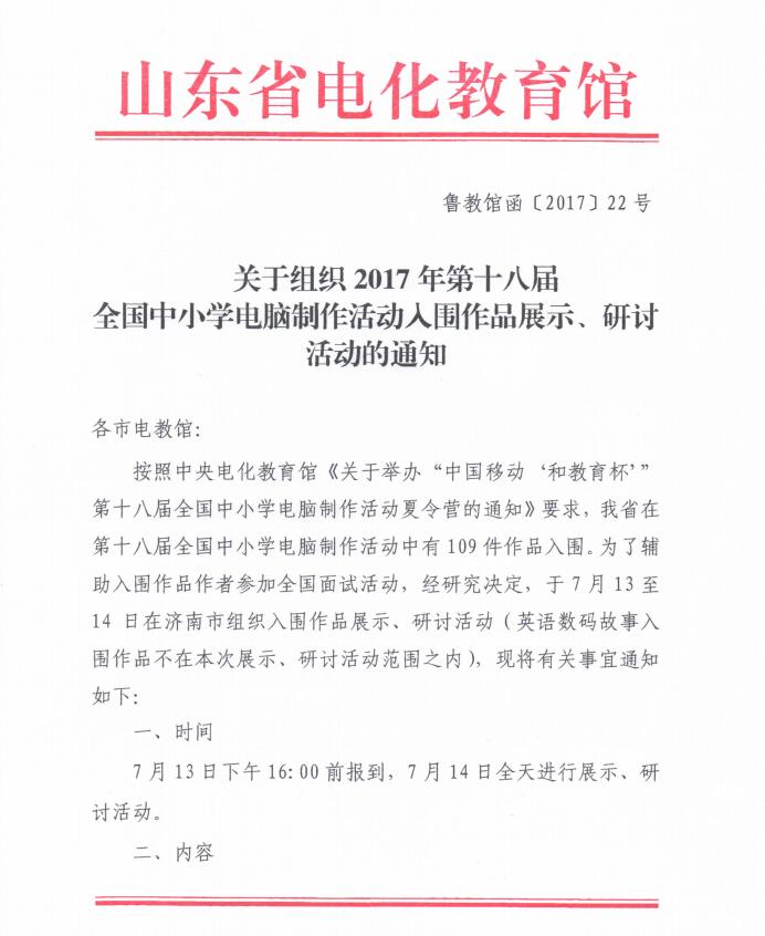 《山东省电化教育馆关于组织2017年第十八届全国中小学电脑制作活动入围作品展示、研讨活动的通知》(鲁教馆函〔2017〕22 号)