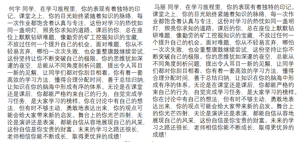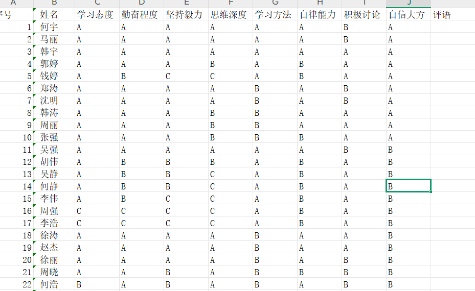 依据 C 至 J 列的评价维度和等级,运用自然语言处理技术,深入分析学生特点,生成贴合个体的生动、具体的评语,增强评价的针对性和感染力,使评价更能准确反映学生的实际情况,为学生提供有价值的反馈。