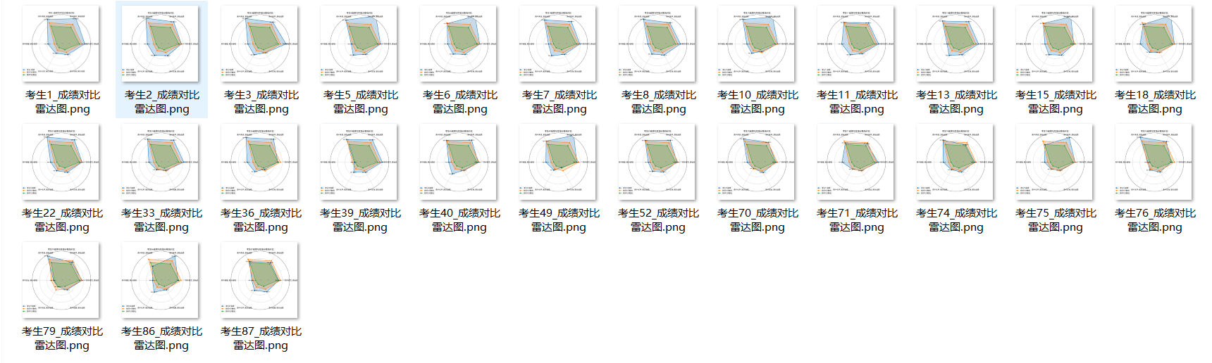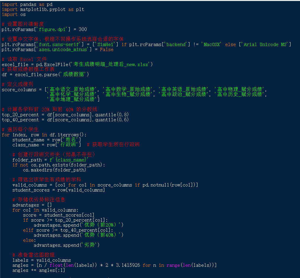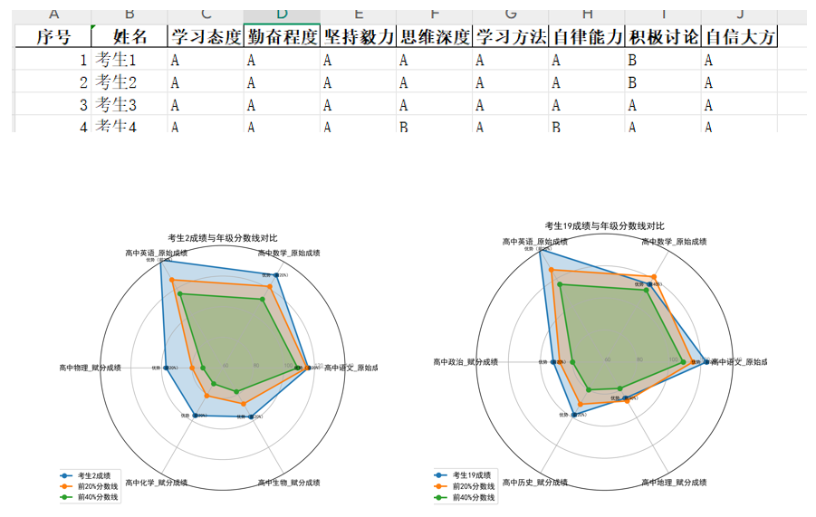 从年级角度出发,读取全年级 “成绩数据” 工作表中的数据,根据学生各科成绩与年级各科成绩前 20%、40% 的分数线,标注出考生各科成绩在班级的优劣势,并利用雷达图进行展示。通过 AI 生成代码,实现批量生成全部学生的雷达图,并按照行政班存入单独文件夹,同时避免雷达图中文显示乱码问题。
