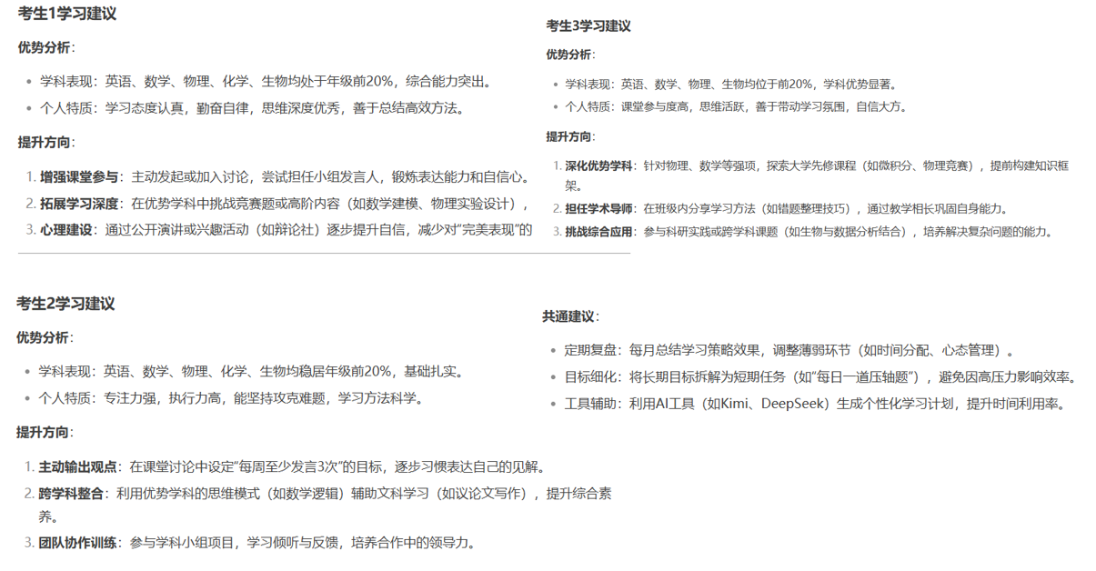 通过上述数据处理、分析和学习建议生成的过程,实现了 “一生一策” 的精准教育模式,为每个学生制定个性化的学习策略,促进学生的全面发展和成长。