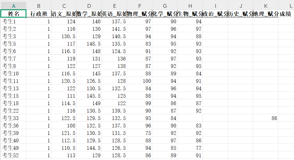 两个表中各有没考的学生,按照学号(或姓名)将两个表格数据合并